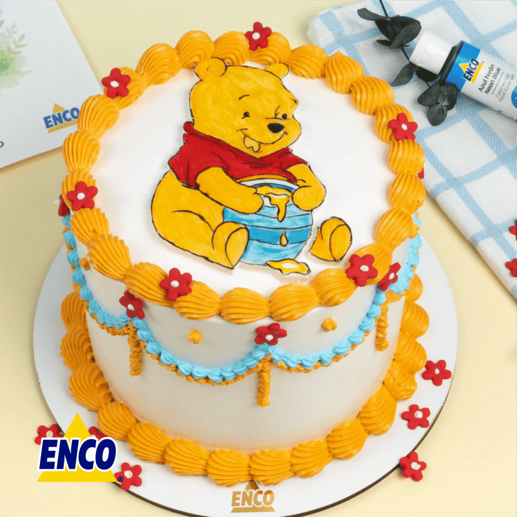 🍯💛 Pastel de Winnie Pooh ¡súper adorable y fácil de hacer! 🐻✨Con Fondant ENCO logramos esta decoración usando la técnica de acuarela, ¡súper fácil de hacer! 🎨Solo necesitas diluir tus colores ENCO con un poquito de agua y… ¡listo! ✨#FamiliaENCO 💛 Les regalamos la PLANTILLA para que también lo pongan a prueba 🧁🐝